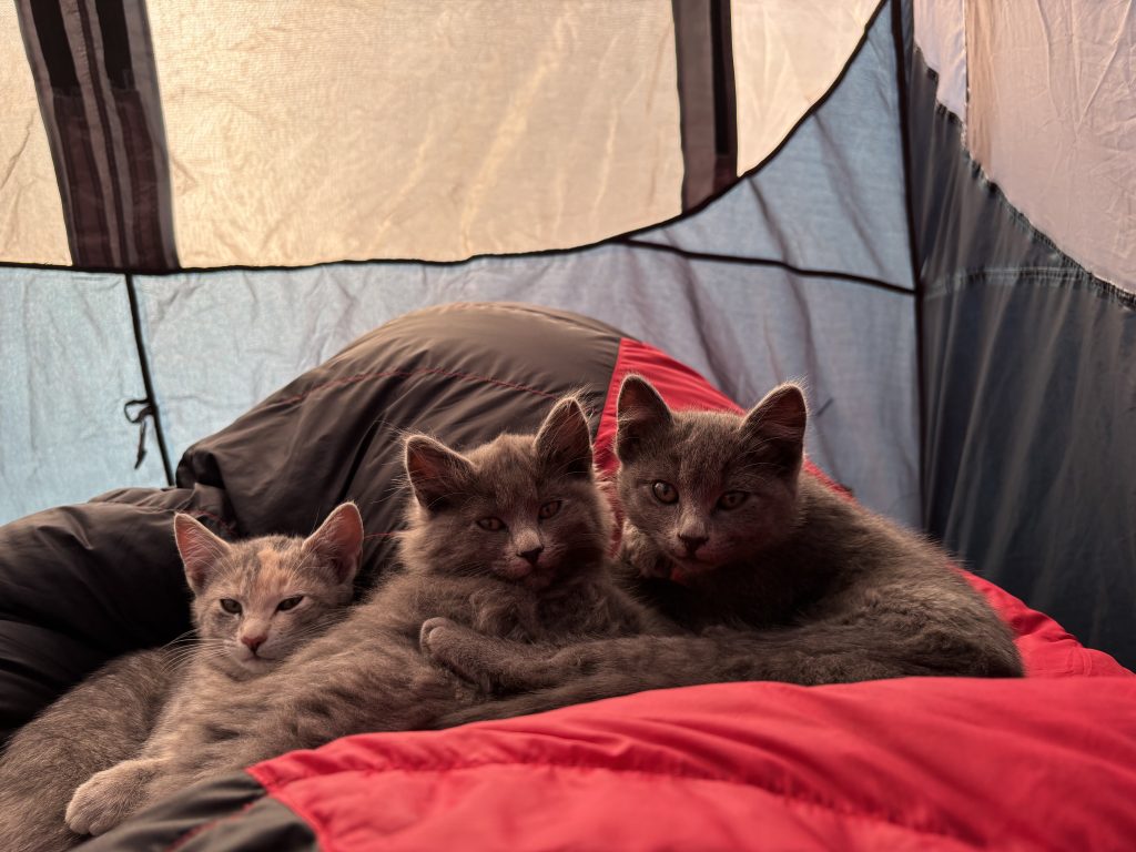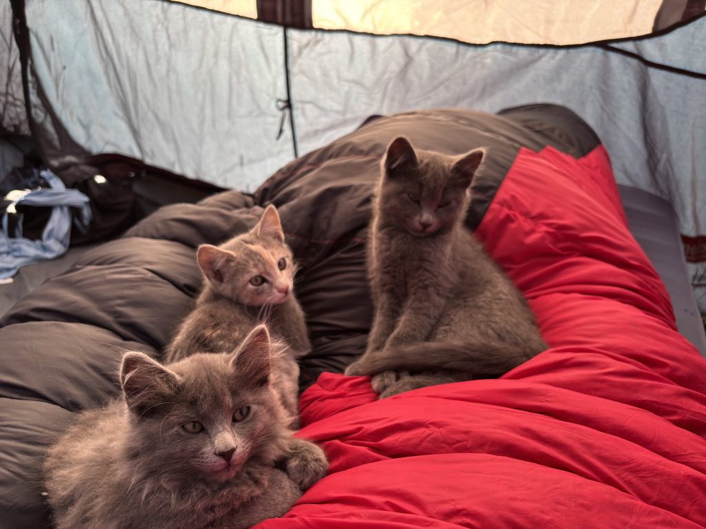 “Hello,” I began, “I have a rather odd story,” and so I recounted our night and the kitten rescue, finishing by showing a picture on my phone of the three rascals cuddled together on my sleeping bag.
